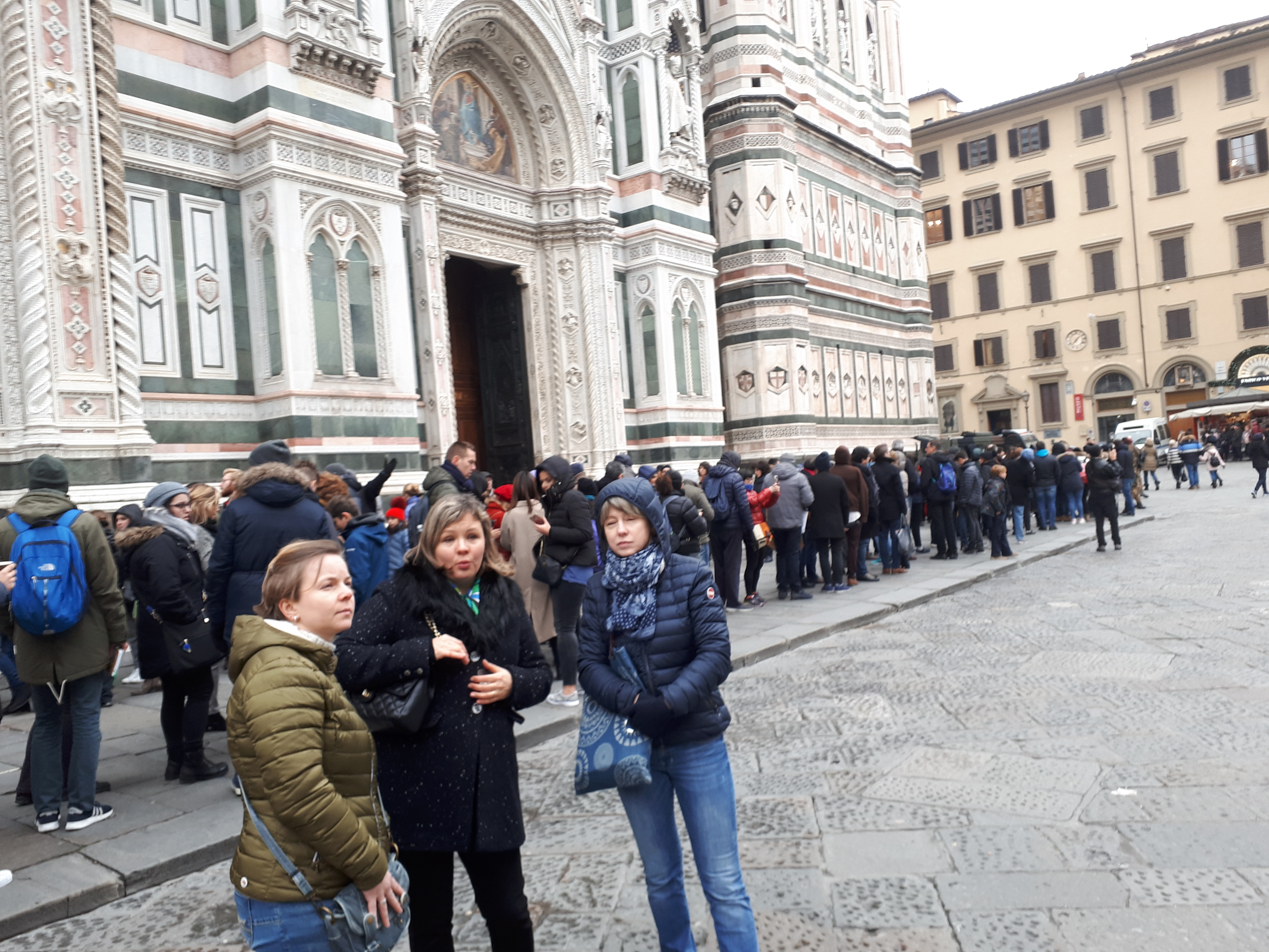 FIRENZE – La coda è infinita: ore d’attesa per chi tenta di andare a visitare il Duomo di Firenze. Motivo? Per far filtrare i turisti, e soprattutto i loro borsoni, al metal detector occorre tempo. Fino a qualche giorno fa, il problema era circoscritto allo spazio Duomo-Battistero con qualche sconfinamento in piazza San Giovanni. Oggi, mercoledì 3 gennaio, il problema è esploso in tutta la sua imponenza. La zona è letteralmente invasa. Tanti non immaginano nemmeno dove sia la fine del serpentone. Nello spazio davanti alla cattedrale la fila diventa doppia. Anche la sicurezza ha dovuto prendere atto della situazione mutata. Infatti, alla pattuglia dei militari in servizio permanente, si è aggiunta una volante della Polizia di Stato. La sorveglianza è garantita, ma la massa di visitatori è impressionante.