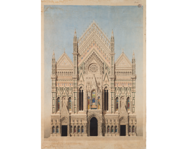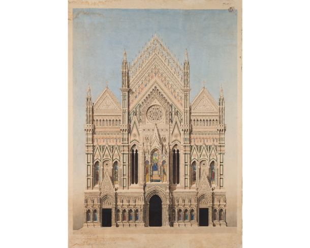 Si tratta di un’opera di Archimede Sacchi (23 luglio 1837- 23 luglio 1886), figlio d’arte del famoso fotografo Luigi, architetto milanese che si occupò in varie occasioni di restauro e completamento in stile di edifici medioevali. Al tempo di questo disegno era appena laureato a Pavia. Il disegno fu inviato alla commissione giudicante della Deputazione promotrice della nuova facciata di Santa Maria del Fiore nel 1862, e questo permette di collocarlo al tempo del primo concorso internazionale bandito nel 1861, con scadenza nel 1862. Si trattò di un bando infruttuoso (cui ne seguiranno altri, finché nel 1887 non si darà l’attuale aspetto alla facciata su disegno del De Fabris), ma, a riprova del suo valore, già a quel tempo Sacchi rivaleggiò con le proposte di emeriti professori architetti da tutta Europa, e sottopose la sua idea al giudizio di una commissione che era composta da personaggi del calibro di Camillo Boito e Gaetano Baccani. Per adesso il disegno non sarà esposto nel Museo, ma entrerà a far parte di uno dei nuclei più importanti della collezione: il fondo di grafica relativo ai concorsi e alle proposte per il rifacimento della facciata del Duomo nell’Ottocento.