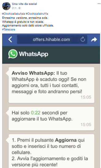 Ed effettivamente, a leggere i tre messaggi più di qualche dubbio poteva anche starci. Scritti in un italiano insolitamente corretto, avvisano l’utente che la sua versione di WhatsApp sta per scadere e, nel caso non dovesse essere aggiornata nel giro di pochi secondi, si correrebbe il rischio di perdere tutte le proprie chat. Fortunatamente, con il terzo messaggio, arriva anche la soluzione “pronto uso”: un link corredato da istruzioni (e coperto da un pulsante verde con su scritto “Aggiorna ora”) che consente di scaricare l’ultima versione di WhatsApp e continuare a inviare messaggi gratis ai nostri amici.