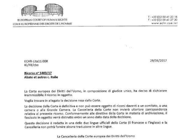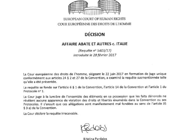 Ma quali sono le ragioni per le quali la Corte in composizione monocratica (un solo giudice, Kristina Pardalos) è arrivata a tali conclusioni? Dopo aver esaminato la documentazione presentata dai ricorrenti e le loro argomentazioni, la giudice ha concluso che: “La richiesta si fonda sull’art. 6§1 della Convenzione europea sui diritti dell’uomo, sull’art. 14 della stessa Convenzione e sull’art1 1 del protocollo n. 1 allegato alla stessa. La Corte ha deciso, alla luce di tutti gli elementi in suo possesso, che i fatti denunciati non costituiscono alcuna apparente violazione dei diritti e delle libertà enumerate nella Convenzione o nei suoi protocolli. Ne consegue che le argomentazioni dei ricorrenti sono infondate ai sensi dell’art. 35 § 3 a) della Convenzione. La Corte dichiara il ricorso irricevibile». Questa è la mia fedele traduzione, ma ecco il testo originale francese della decisione.
