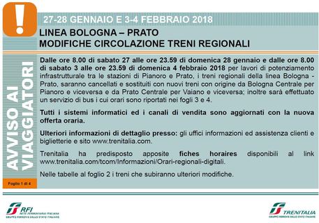 Per consentire l’attività dei cantieri è stato necessario modificare il programma di circolazione dei treni nei due fine settimana. Il nuovo orario – definito con le società di trasporto e di concerto con le Regioni Emilia-Romagna e Toscana – è su www.trenitalia.com. Digitando stazione di partenza, arrivo e data del viaggio, è possibile verificare l’offerta alternativa: treni Regionali sostituiti con autobus, modifiche dei collegamenti a lunga percorrenza. Sarà regolare il servizio sulla linea Alta velocità.