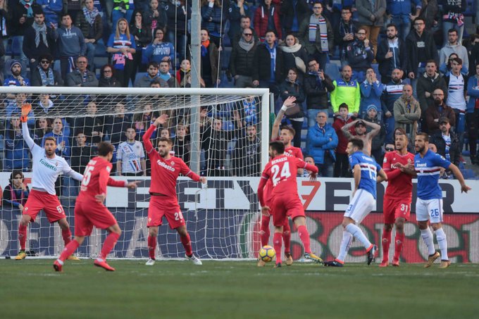 QUAGLIARELLA – Brivido al 22′: Laurini tocca Kownacki che finisce addosso a Pezzella. Il difensore viola resta a terra. I giocatori dellaSamp guardano l’arbitro per capire se è rigore su Kownacki o se deve decidere ilVar. In realtà niente di tutto questo. Solo cure per Pezzella, che deve star fuori qualche minuto: punti di sutura al sopracciglio. Poco dopo altra parata di Sportiello su Kownacki. Fiorentina che subisce. Ramirez e Torreira fanno la differenza. E al 30′ Quagliarella trova il gol. Pezzella, forse ancora un po’ intontito, non riesce a respingere il pallone e l’attaccante, ricorrendo a tutto il suo mestiere, controlla e spedisce all’angolo alla destra di Sportiello. Complimenti a Quaglia, ma la difesa viola non può commettere ingenuità di questo tipo. Viola nervosi. Eysseric colpisce Ramirez dopo aver sub’to un fallo. I blucerchiati chiedono il rosso diretto. L’arbitro opta per il giallo. Non basta. Ramirez ruba palla a Benassi e scatta verso l’area viola. Pezzella lo stende. Ammonizione anche per lui. La Samp tiene il pallino del gioco e manovra agevolmente. La Fiorentina è in chiara difficoltà. La dimostrazione? Benassi butta giù Ramirez e rischia il giallo, che onestamente ci poteva stare. Per fortuna finisce il primo tempo, con i viola in affanno. Troppo in affanno.