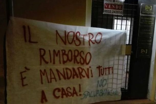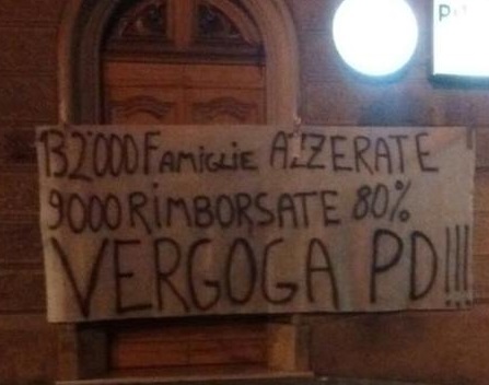 AREZZO – Azzeriamo Renzi,  Chi di decreto ferisce, di decreto perisce ed ancora Il nostro rimborso è mandarvi tutti a casa. E’ quanto scritto in alcuni striscioni affissi la scorsa notte, secondo quanto riportato in una nota, dall’associazione vittime del salvabanche, ad Arezzo, Empoli e Ferrara. Gli striscioni sono stati posizionati, si spiega, dagli esponenti del comitato no salvabanche e dell’associazione vittime del salvabanche davanti alla nuova banca che ha acquisito la CariFe e le sedi del Pd, per ricordare il dramma dei risparmiatori azzerati. Rivogliamo i nostri soldi e le nostre vite, andatevene via, hanno dichiarato gli esponenti del comitato.