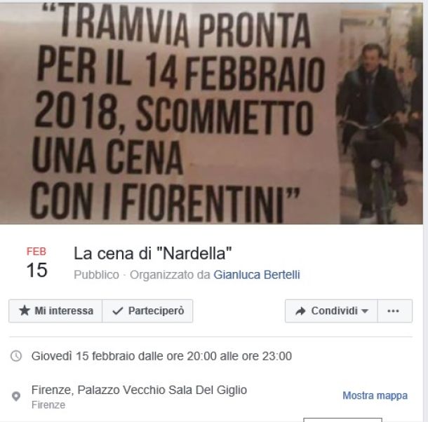FIRENZE – Navigando sul web si incontrano le affermazioni e le iniziative più strane. Per Firenze uno degli argomenti più gettonati è quello della tramvia, soprattutto adesso che si approssima la scadenza del termine dei lavori, promessa più volte dall’amministrazione comunale, e che inconvenienti e ritardi sembrano dover rimandare la scadenza promessa e programmata, quella del 15 febbraio 2018. Una pagina facebook ha inventato addirittura che il sindaco pagherà una cena per il mancato rispetto della promessa, e molti utenti si sono già prenotati. “Tramvia a San Valentino”: Nardella “paga” la scommessa su Facebook, si legge sulla pagina Facebook con l’evento “La cena di Nardella”.