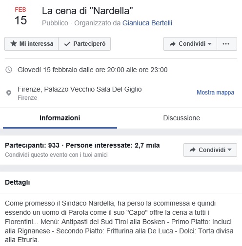 Un appuntamento inventato, di pura fantasia, nata dalla lettura di un articolo apparso sul mensile Il Reporter dal titolo: “Tramvia pronta per il 14 febbraio 2018, scommetto una cena con i fiorentini”. La dichiarazione, attribuita a Firenze Dario Nardella, ha portato l’ideatore dell’evento, Gianluca Bertelli, a rivendicarne la realizzazione da parte del sindaco, organizzando, per il giorno 15 febbraio 2018, il fantomatico appuntamento.
