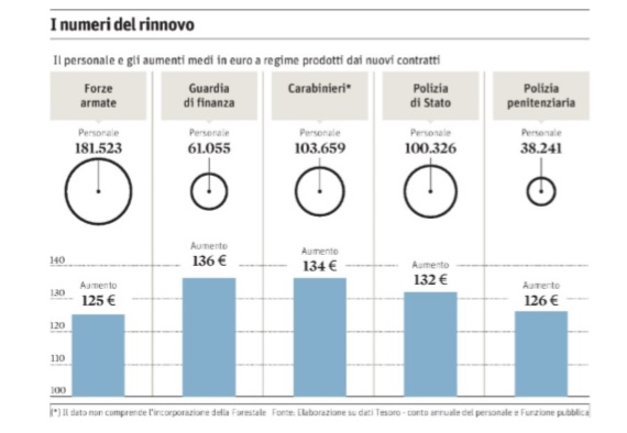 Ricapitolando, giovedì notte è stato siglato l’accordo negoziale riguardante le Forze armate, di sicurezza e di polizia. «Un risultato importante. Si tratta di aumenti a regime non una tantum: si va da 125 euro circa al mese per le forze armate e 132 per la polizia. A questo si aggiungono gli arretrati che arriveranno non appena i tempi tecnici lo permetteranno: circa 556 euro per la polizia e 517 per le Forze armate», ha detto il ministro della Funzione pubblica Marianna Madia, in conferenza stampa a Palazzo Chigi insieme con i colleghi Marco Mdinniti (Interni), Roberta Pinotti (Difesa), Andrea Orlando (Giustizia), Pier Paolo Baretta (sottosegretario all’Economia) e AngeloRughetti (sottosegretario con la delega dal governo alla trattativa). Uno squadrone degno di miglior impiego, ma nel periodo elettorale tutto si fa.