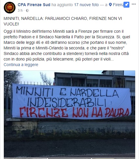 Gli antagonisti osteggiano il ministro Minniti perché cerca di affrontare seriamente i problemi della sicurezza e dell’immigrazione. Anche per la sua visita fiorentina è stato diffuso dal Cpa Firenze Sud il volantino, che riproduciamo, nel quale si nota un significativo scambio nel nome del prefetto: