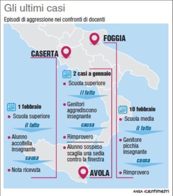 Si stanno intensificando in maniera preoccupante le aggressioni a parte di studenti e genitori nei confronti di insegnanti per presunti torto subiti dai ragazzi. Occorre intervenire duramente per stroncare questi episodi che derivano in buona parte dalla scarsa attenzione delle famiglie. La tabella qui sopra riporta gli ultimi 3 episodi prima di questo, avvenuti rispettivamente a Caserta, Avola e Foggia.