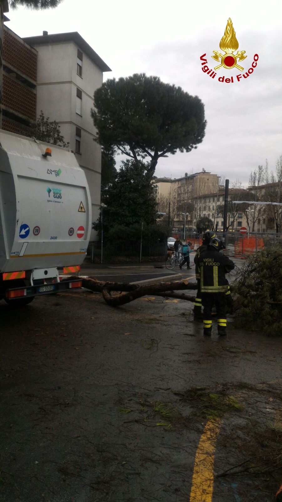Firenze: via Mariti ostruita da un grosso ramo. Camion della nettezza urbana contro un albero