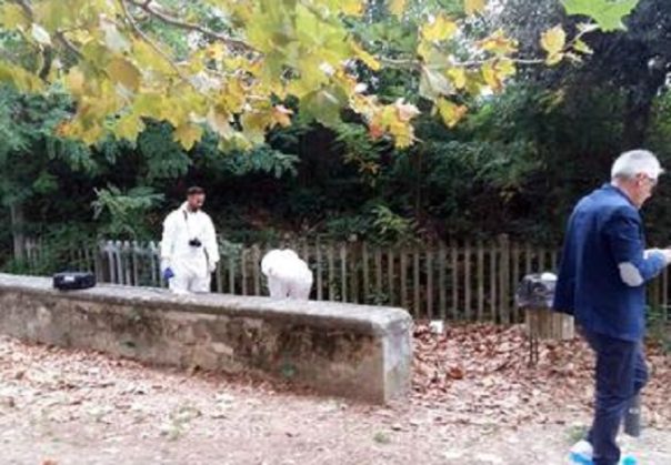 I rilievi delle forze dell’ordine nel Parco dell’Ambrogiana a Montelupo Fiorentino (Firenze), dove una ragazza e’ stata trovata in una pozza di sangue e ferita alla testa, 14 ottobre 2017.