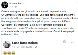 La sua denuncia di notizia falsa riferisce di una sua (inesistente) cugina, Francesca, che sarebbe stata assunta al Senato come portaborse a 23 mila euro al mese. “Se sei indignato anche tu condividi!” si conclude la fake news. Il segretario dem ripubblica il post dell’utente che l’ha rilanciata, tal Luca Rosestolato, marchiandolo con la scritta in bianco “fake news”. Sempre più arduo il cammino del rottamatore verso l’appuntamento elettorale, guarda caso fissato per un altro giorno 4, questa volta del mese di marzo. Certo non di buon auspicio per lui, ricordando gli esiti del referendum del 4 dicembre 2016.