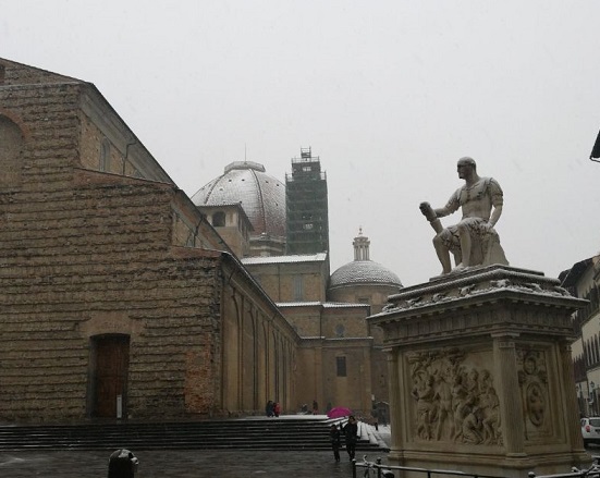 FIRENZE . Stamani il Presidente dell’Opera medicea laurenziana ha voluto sincerarsi della situazione nel quartiere, e un tecnico dell’Opera, il Geom. Federico Matteuzzi, ha fatto una ricognizione, scattando alcune foto che danno l’idea di quanto avviene nella zona. Piazza semideserta (fa anche freddo), chiostro della Basilica innevato, Cupola, tetti e coperture, parte della scalinata con un pò di neve, Mercato di san Lorenzo circondato da una coltre, sia pure bassa, di manto bianco. Ma sembra che le auto possano circolare senza problemi, almeno per ora. Gli ingressi dei visitatori alla Basilica e al chiostro e le visite guidate sono comunque in funzione, nonostante il tempo. Il personale sta fornendo un eccellente servizio. Lascio la parola alle immagini:
