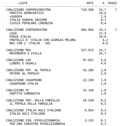 ROMA – Risultati degli scrutini di 3954 sezioni su 3954. Il dato relativo alle liste e’ composto dalla somma dei voti ottenuti in via diretta piu’ quelli derivanti dal calcolo della cifra elettorale nei collegi uninominali il cui scrutinio e’ stato completato. Si nota come lo scarto dei voti fra centrosinistra e centro destra sia ridotto a poco più di 30.000, mentre il M5S riscuote oltre mezzo milione di suffragi.