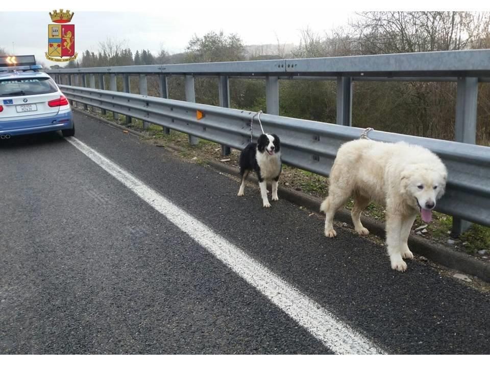 I due cani in fuga sulla Fi-Pi-Li con l’agente della Polstrada che li ha salvati