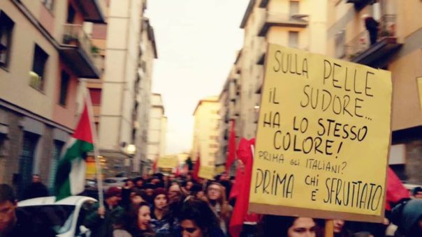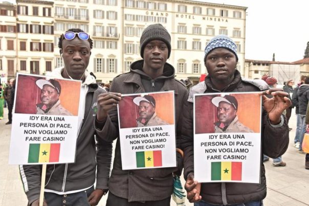Agli angoli del ponte Vespucci attaccato con lo scotch sul muro in un volantino si legge: “Cari fratelli e sorelle italiani, se avete fame oggi; se siete senza lavoro; se siete diventati poveri, noi neri, noi africani, non siamo colpevoli; non siamo responsabili delle vostre rogne. Cercate i responsabili da Sarkozy a Berlusconi, alleati hanno bombardato la Libia e il resto dell’Africa. Se le vostre bombe cadessero in Italia cosa fareste? Dov’è la colpa del povero Diene Idy, il fatto di essere nero, essere nero è un reato in Italia basta!”. In un’altra scritta si legge: “Salvini, senza di noi di cosa avresti parlato?”. Al corteo viene fatto percorrere il perimetro dei lungarni fra ponte Vespucci e ponte alla Carraia, in una specie di girotondo che consente di osservare bene tutto lo svolgimento della manifestazione che sta procedendo in modo pacifico. Le forze dell’ordine presidiano il corteo mantenendosi ad una certa distanza, anche con postazioni fisse ma finora non c’è stato bisogno di intervenire.