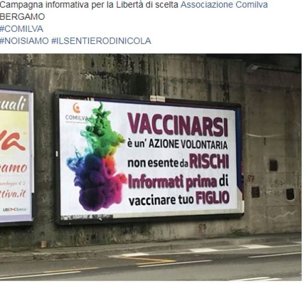 E’ quanto si legge su tre cartelloni di sei metri per tre metri affissi ad Arezzo e Viareggio (Lucca) nei giorni precedenti la scadenza, fissata per oggi 10 marzo, per presentare a scuola i certificati vaccinali o comunque le richieste di appuntamento. A riportarlo alcuni quotidiani locali. I manifesti no-vax sono a firma di Comilva, Coordinamento del