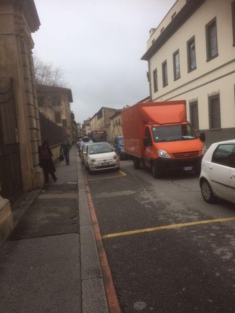 Firenze: code interminabili, al mattino, in via Lamarmora, piena di autobus, di auto e di furgoni. Causa, i lavori in via della Colonna (foto)