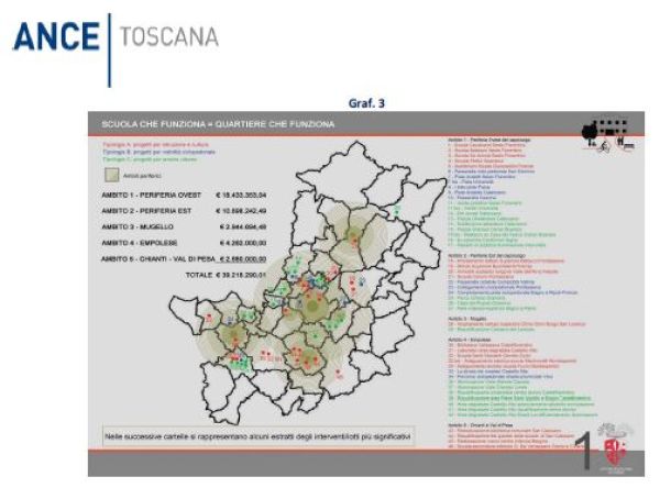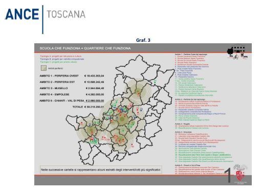 Un quadro che fa emergere la pronta risposta dei Comuni toscani a questa importante opportunità di finanziamento; ora è necessario monitorare i tempi di realizzazione di tali progetti, visto che la maggiore criticità riguarda la rapidità di aggiudicazione degli appalti.