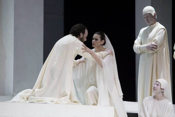 L’allestimento, coprodotto con la Fenice di Venezia e firmato anche per la regia da da Pier Luigi Pizzi (già grande scenografo con registi di genio come Ronconi), è geometrico e monocromatico e accentua fino all’esasperazione l’idea di classicità un po’ da museo, sottolineata anche dal bianco dominante degli abiti, cambiato col nero solo quando hanno da segnalare l’incombere della morte.