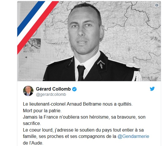 «Il tenente colonnello Arnaud Beltrame ci ha lasciato. E’ morto per la patria. La Francia non dimenticherà mai il suo eroismo, la sua bravura, il suo sacrificio. Con il cuore addolorato, invio la vicinanza di tutto il Paese alla sua famiglia, i suoi parenti e i suoi colleghi della Gendarmeria dell’Aude», scrive il ministro dell’interno Gérard Collomb su Twitter pubblicando una foto del tenente colonnello con la bandiera tricolore francese. Con la morte di Beltrame, il bilancio