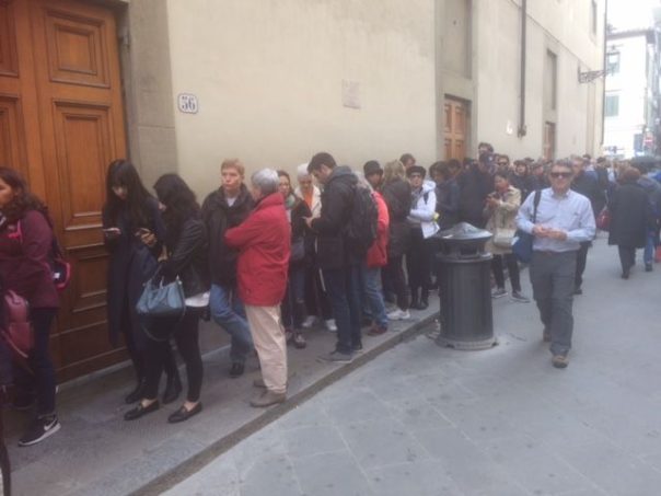 ACCADEMIA – ore 9,30: file di turisti in coda per entrare a vedere il David, nessuna auto di servizio delle Forze dell’ordine nei paraggi, un’auto privata passa lungo la strada occupata dai dipinti di venditori abusivi, tornati in gran numero; erano praticamente scomparsi quando c’era la sorveglianza della Guardia di Finanza.