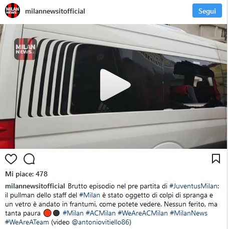 TORINO – Attimi di tensione prima del big match della trentesima giornata di serie A tra Juventus e Milan, al via alle 20.45. Il pullmino che trasportava lo staff rossonero all’Allianz Stadium di Torino è stato preso a sprangate mentre era fermo a un semaforo. Un finestrino è stato rotto ma per fortuna non ci sono stati feriti. Il mezzo, partito dall’hotel del centro di Torino dove alloggiano i rossoneri, stava appena rientrando dallo stadio dopo aver portato parte dello staff: mentre era fermo al semaforo di corso Scirea all’angolo con corso Vercelli, è stato colpito da quattro teppisti a volto coperto e con sciarpe bianconere: un finestrino è stato frantumato, ma le persone a bordo sono rimaste fortunatamente illese. L’episodio, avvenuto intorno alle 18, è stato riportato da Milannews.