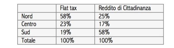 Nel caso della flat tax buona parte del risparmio di imposta (il 58 per cento del totale, cioè 34 miliardi su un totale di 58) andrebbe a favore delle famiglie residenti nell’Italia settentrionale e meno di un quinto a quelle residenti nel Mezzogiorno. Al contrario, il 58 per cento della spesa totale per il reddito di cittadinanza (cioè circa 9 miliardi secondo le previsioni di spesa dei proponenti, fino al doppio se si prende alla lettera il disegno di legge) sarebbe ottenuto dalle famiglie del Sud e solo un quarto andrebbe al Nord.