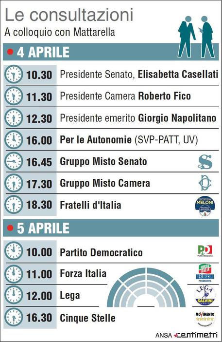 Dopo i confronti con i partiti il capo dello Stato assumerà le sue decisioni: o affidando un incarico, pieno o esplorativo, o avviando un secondo giro di consultazioni, o prendendosi una pausa durante la quale avviare ulteriori contatti informali. Sergio Mattarella inizierà quindi mercoledì mattina i suoi colloqui nel suo studio “alla Vetrata”, ricevendo separatamente i presidenti delle due camere.