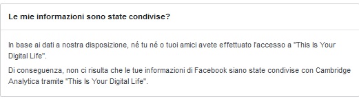 Ma se volete farlo anche voi, basta collegarsi a un sito speciale. Oltre alle notifiche agli utenti interessati, Facebook ha infatti lanciato uno strumento accessibile a tutti per capire se i propri dati sono stati condivisi. Basta accedere a una pagina intitolata «Come posso sapere se le mie informazioni sono state condivise con Cambridge Analytica?». Se non si è stati interessati alla fuga di dati apparirà il seguente messaggio: «In base alle nostre informazioni, tu e nessuno dei tuoi amici si sono registrati a This Is Your Digital Life», cioè l’app che ha fatto scoppiare lo scandalo sulla privacy. In Italia i casi stimati sono poco più di 214 mila.