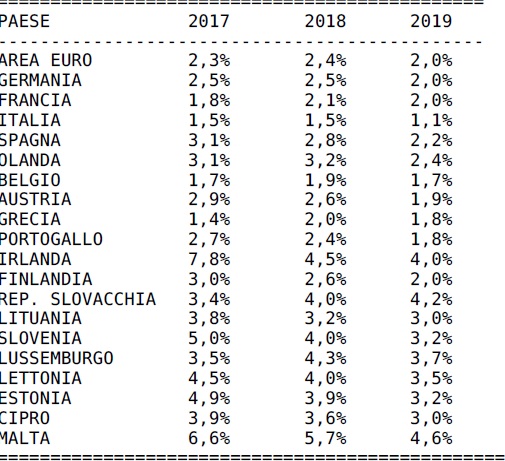piu’ elevati di quello dell’Italia. Ecco di seguito una tabella che mostra l”andamento del pil per il 2017, 2018 e 2019 dei paesi di Eurolandia.