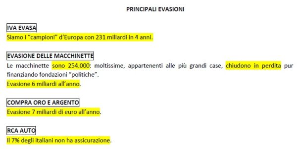 «Ogni anno l’Agenzia delle Entrate e la Guardia di Finanza verificano non più di 200.000 contribuenti, pur avendo a disposizione il Servizio SERPICO e conoscano, nominativamente, almeno 2 milioni e mezzo di evasori totali; ci si ostina a controllare le denunce di cittadini a reddito fisso compresi i pensionati, permettendo così, con un lavoro non mirato e pressoché inutile, l’evasione di cui sopra. I dipendenti e funzionari in organico agli organismi finanziari sono 90.000 (in America sono 100.000 benché negli Stati Uniti, il Pil sia 10 volte quello italiano e il Paese sia molto più grande).