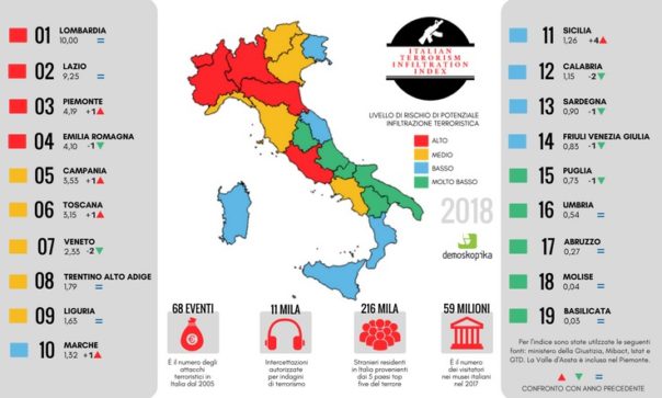 Sono quattro in tutto le regioni che si collocano nell’area definita ad «alto livello di potenziale infiltrazione terroristica» dai ricercatori di Demoskopika: Lombardia che con il massimo punteggio, pari a 10, si conferma, per il terzo anno consecutivo, in cima all’Italian Terrorism Infiltration Index 2018 distanziata di poco dal Lazio con 9,25 punti. Seguono nell’area rossa Piemonte (4,19 punti) che fa un balzo in avanti rispetto allo scorso anno e, infine, Emilia Romagna (4,10 punti) che, al contrario, cedendo il posto al Piemonte retrocede di una posizione. La Toscana è al limite della top ten con 2,40 punti.