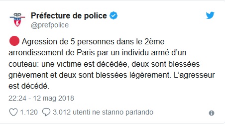 PARIGI – E’ tornato il terrore a Parigi, in pieno centro, a due passi dal teatro dell’Opera: un uomo, gridando «Allah Akbar!» ha accoltellato i passanti di una via piena di gente al sabato sera, per una serata di primavera. La polizia ha reagito in pochi secondi, abbattendo l’assalitore, un ceceno di 21 anni, incensurato ma schedato “S” «per la sua vicinanza agli ambienti radicali islamici».