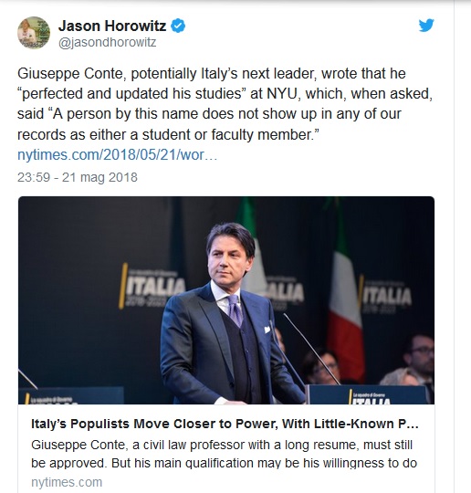 Il giornalista ha affermato che «Giuseppe Conte, potenzialmente il prossimo leader italiano, ha scritto che ha perfezionò e ha aggiornato i suoi studi alla New York University, ma, quando abbiamo chiesto, ci è stato risposto: una persona con questo nome non compare nei nostri archivi come studente o membro di facoltà». La portavoce dell’università americana, Michelle Tsai ha poi precisato che: «è possibile che Conte abbia seguito qualche programma di due giorni per i quali la scuola non tiene registri».