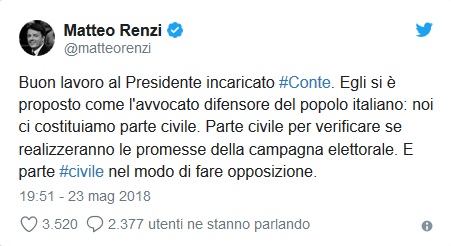 ROMA – «Buon lavoro al presidente incaricato Conte. Egli si è proposto come l’avvocato difensore del popolo italiano: noi ci costituiamo parte civile. Parte civile per verificare se realizzeranno le promesse della campagna elettorale. E parte civile nel modo di fare opposizione». Questo il commento sferzante di renzi, lanciato, come suo solito, con un tweet. Confermando in tal modo e lui, con la parte del Pd che lo seguirà, faranno opposizione al governo giallo-verde.