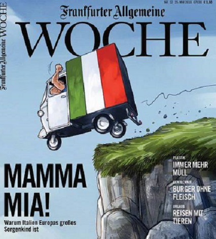 E inoltre l’inserto settimanale della Frankfurter Allgemeine Zeitung dedica la copertina dell’ultima edizione all’Italia (vedi foto sopra), e sceglie l’esclamazione – “Mamma mia!”- accompagnata da una vignetta in cui un’ape tricolore, con i simboli di M5S e Lega sullo sportello, precipita in un burrone. E aggiunge la frase: «L’Italia, il caso che dà pensieri all’Europa: un alto debito e poca prospettiva di miglioramento. Adesso i populisti dovrebbero assumere la leadership».