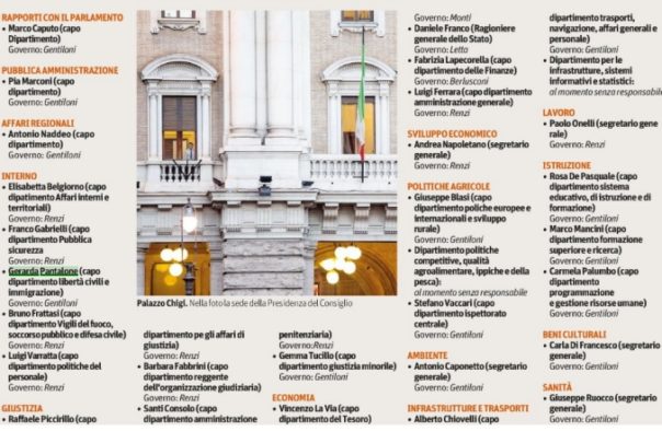 Ma non ci sono soltanto da individuare vertici di aziende importanti, a ogni cambio di Governo deve essere rinnovata la macchina amministrativa in ossequio al principio dello spoils system, 44 poltrone legate alle sorti del Governo.