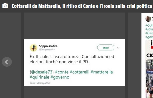 Intanto il clima teso fra le forze politiche ha indotto molti partiti a chiedere di anticipare addirittura il voto a luglio. Su questa posizione si sono ritrovati già M5S, Lega e anche il Pd. Il pressing generale per il voto a fine luglio ha messo quindi in stand by Carlo Cottarelli, che ha fatto il punto della situazione con il Capo dello Stato e insieme probabilmente hanno deciso di prendere tempo per valutare fino a che punto ci sia convergenza tra le forze politiche per il voto il 29 luglio. Lo stato della situazione è stato riferito non dai diretti interessati, ma dal portavoce del presidente Mattarella, Giovanni Grasso: «Il presidente del Consiglio incaricato, Carlo Cottarelli – ha detto – ha riferito al Capo dello Stato della situazione. I due si rivedranno domani mattina». Voci dal sen fuggite, successive, il che dà l’idea dell’aria d’incertezza che si respira anche al Quirinale, riferiscono che Cottarelli avrebbe semplicemente