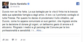 Nella serata di oggi, centinaia di cittadini si sono ritrovati in via Canova per una manifestazione spontanea a sostegno della famiglia di Duccio. Nel pomeriggio all’Isolotto c’era stato un consiglio di quartiere straordinario. In serata anche il Consiglio comunale, col ricordo del sindaco Nardella, che ha annunciato il lutto cittadino.