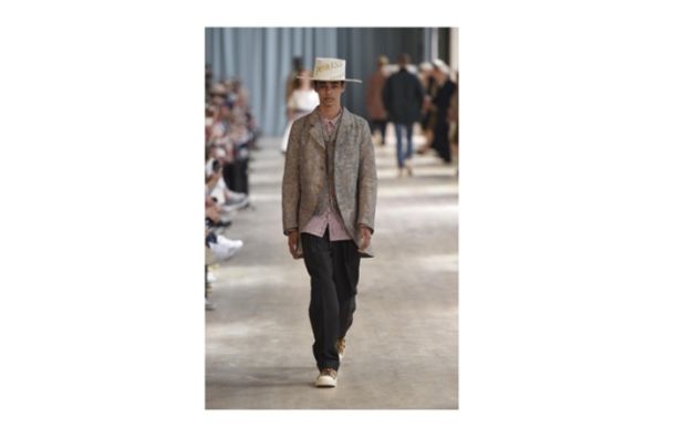 Sono 28 gli outfit proposti da Curradi per i suoi uomini in armonia con la natura, che costruiscono architetture spontanee mescolandosi o fondendosi con l’ambiente. In maniera naturale. Il suo è un guardaroba adatto alla pesca lungo l’Arno, certamente, ma assemblato istintivamente in maniera fresca e giovanile. Le forme sono fluide e con un pizzico di pragmatismo degli anni Novanta. Ciò che è necessario diventa decorativo mentre la decorazione acquista funzionalità. La seta spalmata tinta in capo per i pezzi impermeabili, le cuciture delle vele sui capi tecnici. Reti e corde sono impresse su T-shirt, i pesci diventano stampe e i segni di corrosione salina si ritrovano su giacche-camicia di seta. Sciarpe si trasformano in camicie per catturare la leggerezza del vento, in una palette di colori fatta di toni terrosi e acquosi che si fondono nelle sfumature di Bocca d’Arno.