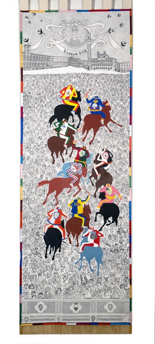 SIENA – Tantissimi applausi e anche uno spettatore d’eccezione, il capo della polizia Franco Gabrielli, per il drappellone per il Palio di Siena che si corre il 2 luglio, firmato dal disegnatore e vignettista Emilio Giannelli, senese doc. Il ‘cencio’ è stato presentato stasera, come di consueto, nell’entrone di Palazzo Pubblico, alla presenza anche del neo sindaco Luigi De Mossi che ha commentato: «Questa sera sono qui in veste di sindaco ma vi assicuro che l’emozione che ho provato sentendo il suono delle chiarine è la stessa di sempre. Uno squillo che ci ricorda che adesso è arrivato il tempo di vivere la nostra Festa».