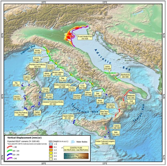 Le altre aree già individuate riguardavano quella compresa tra Trieste, Venezia e Ravenna, il golfo di Taranto, Oristano e Cagliari; ma anche la Versilia in Toscana, Fiumicino e Fondi nel Lazio e la zona dell’Agro pontino, mentre in Campania il rischio ricade sulla piana del Sele e sul Volturno, in Sicilia sull’area di Catania e alle Isole Eolie.