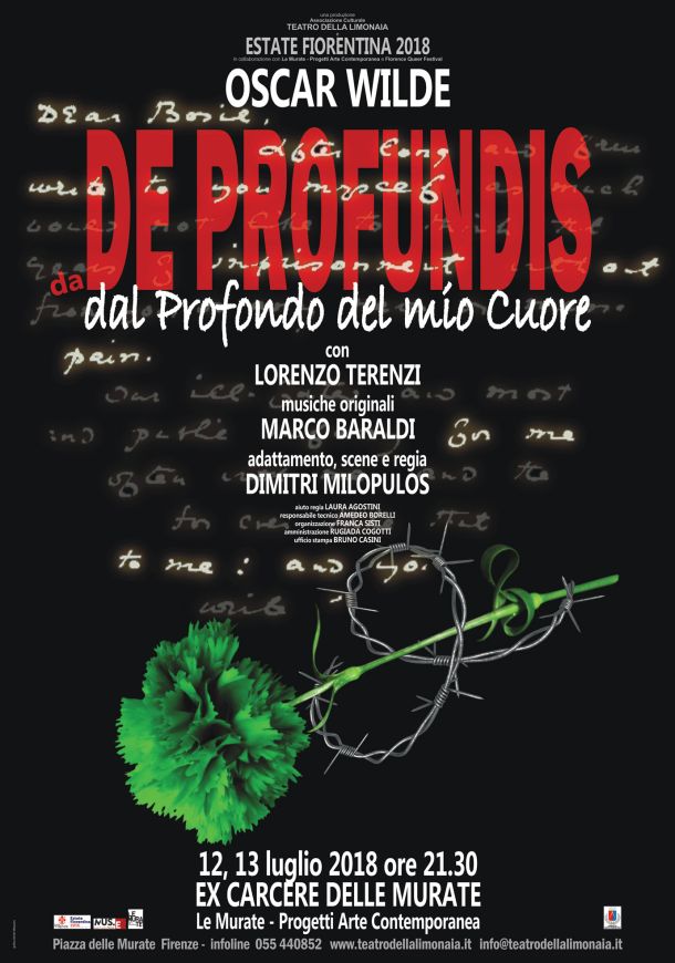 una produzione Associazione Culturale Teatro Della Limonaia e Estate Fiorentina 2018 in collaborazione con Le Murate – Progetti Arte Contemporanea e Florence Queer Festival: «Dal profondo del mio cuore», da De profundis di Oscar Wilde, con Lorenzo Terenzi, adattamento, scene e regia Dimitri Milopulos; musiche originali Marco Baraldi, pianoforte Marco Baraldi, violino Sofia Astarita, mixaggio Federico Ciompi.