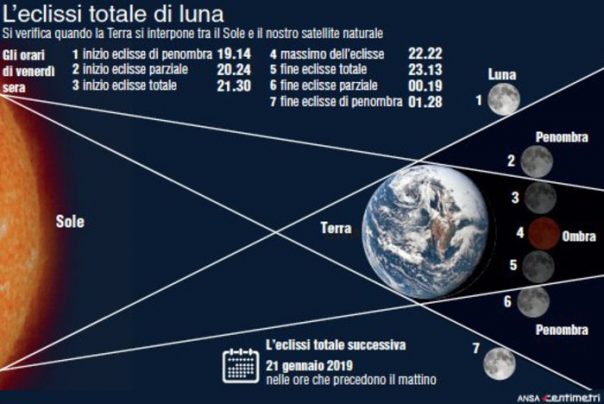 rispetto alla Terra e il 31 luglio sarà alla minima distanza dal nostro Pianeta, pari a 57.590.630 chilometri. A tingere di rosso la Luna è invece la sua posizione rispetto alla Terra: quest’ultima si trova tra il Sole e la Luna e proietta sul satellite un cono d’ombra.