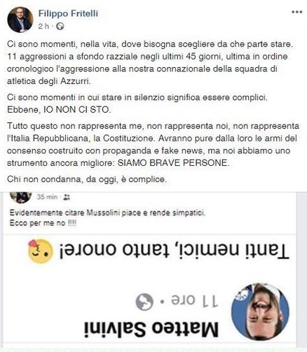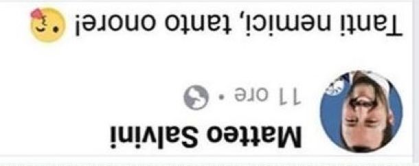 PARMA – A proposito d’incitamento all’odio, accusa rivolta da molte parti al ministro dell’interno, si segnala particolarmente un post su Facebook che raffigura Matteo Salvini rovesciato, come a testa in giù. Con il commento «Evidentemente citare Mussolini piace e rende simpatici. Ecco per me no !!!!». L’idea, che sta suscitando polemiche sui social, è stata di Filippo Fritelli, esponente del Pd, sindaco di Salsomaggiore e presidente della Provincia di Parma, che ha risposto in questo modo alle parole del ministro dell’Interno Tanti nemici, tanto onore. «Per molti questi soggetto è uno sconosciuto e si comporta come tale, ma invece è il Presidente della Provincia di Parma, neanche a dirlo è del PD, certa gente si commenta da sola! #Frittellivergogna #PDvergogna», ha scritto il deputato leghista Gianluca Vinci, segretario della Lega Emilia. Anche altri parlamentari del Carroccio lo hanno attaccato, ma Fritelli ha replicato ancora su Fb: «Ci sono momenti, nella vita, dove bisogna scegliere da che parte stare. Ci sono momenti in cui stare in silenzio significa essere complici. Ebbene, IO NON CI STO».