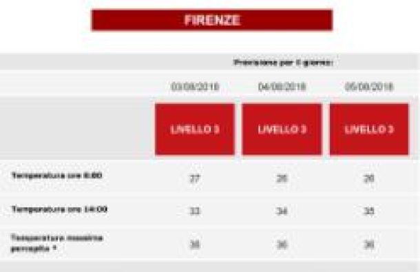 FIRENZE . Caldo da bollino rosso anche oggi,  domenica 5 agosto. Lo annuncia il nuovo bollettino della protezione civile del Comune sulla base delle previsioni meteo, che confermano l’ondata di calore di ‘livello 3’ . Il codice rosso è il terzo livello di allerta in una scala che va da zero a tre. L’amministrazione raccomanda di limitare le attività all’aperto soprattutto per gli anziani ma anche bambini e soggetti fragili, oltre a tutti i consigli utili per affrontare le ondate di calore che sono a disposizione sul sito della protezione civile.