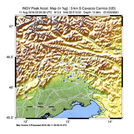 UDINE – Un terremoto di magnitudo 3.9 è avvenuto a 5 km da Cavazzo Carnico, in provincia di Udine. L’ipocentro è stato localizzato a una profondità di 13 km. La scossa è stata registrata alle ore 5.30 dal centro nazionale terremoti. Alcuni minuti prima era stata registrata nella stessa zona una scossa di magnitudo 3.0. Poi ne è stata rilevata un’altra di 2.3. Molte persone sono state svegliate e decine di telefonate sono giunte ai centralini delle forze dell’ordine e della Protezione civile del Fvg.