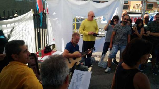 FIGLINE VALDARNO (FIRENZE) – Visita particolarmente gradita ( certo molto più di quelle di politici) stamani al presidio davanti ai cancelli della Bekaert di Figline Valdarno (Firenze), dove è arrivato il cantante inglese Sting che ha voluto portare la sua solidarietà ai 318 operai che nel giugno scorso hanno ricevuto le lettere di licenziamento. Sting prima ha ascoltato le loro storie, di come si è arrivati alla possibile chiusura, per ora rimandata di un mese dopo gli incontri al Mise. Ha salutato il sindaco di Figline Giulia Mugnai, i rappresentanti delle Rsu e dei sindacati, e poi ha rivolto parole di solidarietà e vicinanza alle circa 400 persone presenti. Infine Sting ha preso la chitarra e ha iniziato a cantare alcune delle sue canzoni più note e tra queste ‘The last ship’, scritta per ricordare la chiusura del grande cantiere navale dove lavoravano il nonno e il padre a Wallsend, non lontano da Newcastle, dove lui abitava da bambino. Gli operai hanno risposto con “Una vita da mediano” di Ligabue. Proprio lunedì l’azienda riprende la produzione