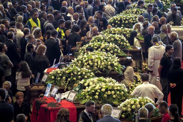 Il rito funebre ha recuperato rispetto con l’arrivo di Mattarella. Un lungo, rispettoso applauso ha accolto la chioma bianca del presidente, che si è intrattenuto con i familiari delle vittime, sostando davanti a ciascuna bara visibilmente commosso.