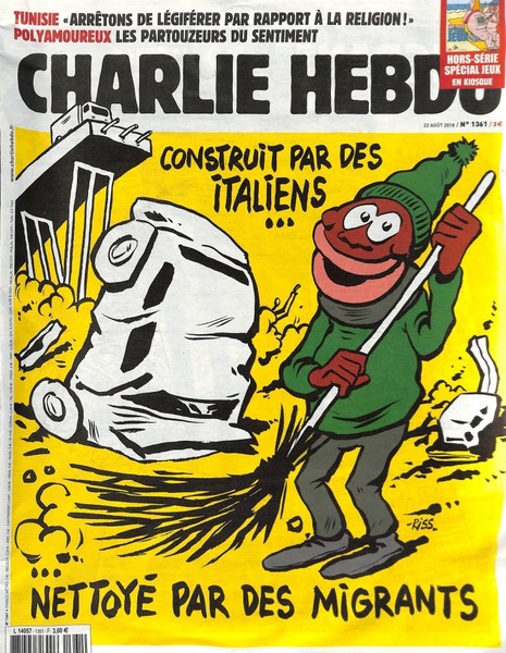 PARIGI – Dal sito La voce di genova.it riprendiamo una notizia e una foto sulla macabra ironia del periodico satirico francese Charlie Hebdo sul crollo del ponte Morandi. E” una copertina al vetriolo quella dell”ultima edizione del settimanale, la numero 1361, che lega la tragedia di Genova alla crisi dei migranti. L”immagine è una vignetta su sfondo giallo che mostra il ponte spezzato in alto a sinistra mentre a terra, tra le macerie e un”auto appena precipitata, c’è’un immigrato nero che spazza il suolo con una ramazza: «Costruito dagli italiani… – è il commento di Charlie Hebdo – … pulito dai migranti». Un oltraggio alla memoria delle vittime e al lavoro difficile e encomiabile dei nostri vigili del fuoco, delle forze dell’ordine e di volontari, altro che migranti, che si sono ben guardati dal collaborare.